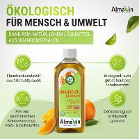 When processing citrus fruits, only the pulp is used, the peel is usually thrown away unused - but it can be used to produce many useful products. For example, the AlmaWin orange oil cleaner! The peels contain orange terpenes, a purely natural solvent that can be used pure or diluted. The orange oil cleaner dissolves, for example, adhesive residues, wax or chewing gum and all kinds of stubborn stains in the household. the concentrate is extremely economical to use and spreads a wonderfully fresh orange scent. the AlmaWin orange oil cleaner is vegan, eco-certified by Ecogarantie and has been successfully dermatologically tested. The bottle is made from 100% recycled PET.