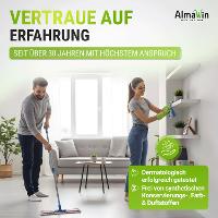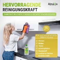 Thanks to the combination of skin-friendly, natural surfactants and plant-based moisturizing ingredients, AlmaWin household cleaner provides excellent cleaning results and is gentle on the skin. It is particularly suitable for all water-resistant surfaces such as worktops, kitchen furniture, tiles, plastic surfaces, window sills and floors of all kinds - always follow the manufacturer's cleaning recommendations for sensitive surfaces.