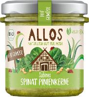 Spinat* (44%), Zwiebeln* 18%, Sonnenblumenkerne*, Sonnenblumenöl*, Pinienkerne* (3%), Agavendicksaft*, Kartoffelstärke*, Knoblauch* (2%), Zitronensaftkonzentrat*, Meersalz, SENF* (Wasser, SENFSAATEN*, Branntweinessig*, Meersalz, Kurkuma*, Koriander*, Paprika* edelsüß, Piment*), Zwiebelpulver*, schwarzer Pfeffer*, Verdickungsmittel: Johannisbrotkernmehl*.| Energie | Fett | gesättigte Fettsäuren | Kohlenhydrate | Zucker | Ballaststoffe | Eiweiss | Salz |