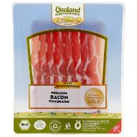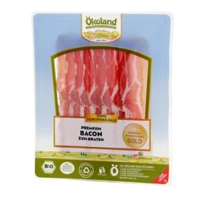 Matured for over 2 months using the artisan natural maturing process without nitrite curing salt and then gently smoked, Ökoland Premium Bacon develops its genuine taste. Only lean pork belly is processed for this, all under strict quality controls. Certified organic. Heat the bacon thoroughly before eating. Naturally gluten-free, lactose-free, natural yeast formation through fermentation. Innovative packaging made of polypropylene (PP) ensures high recyclability for the circular economy of packaging materials.